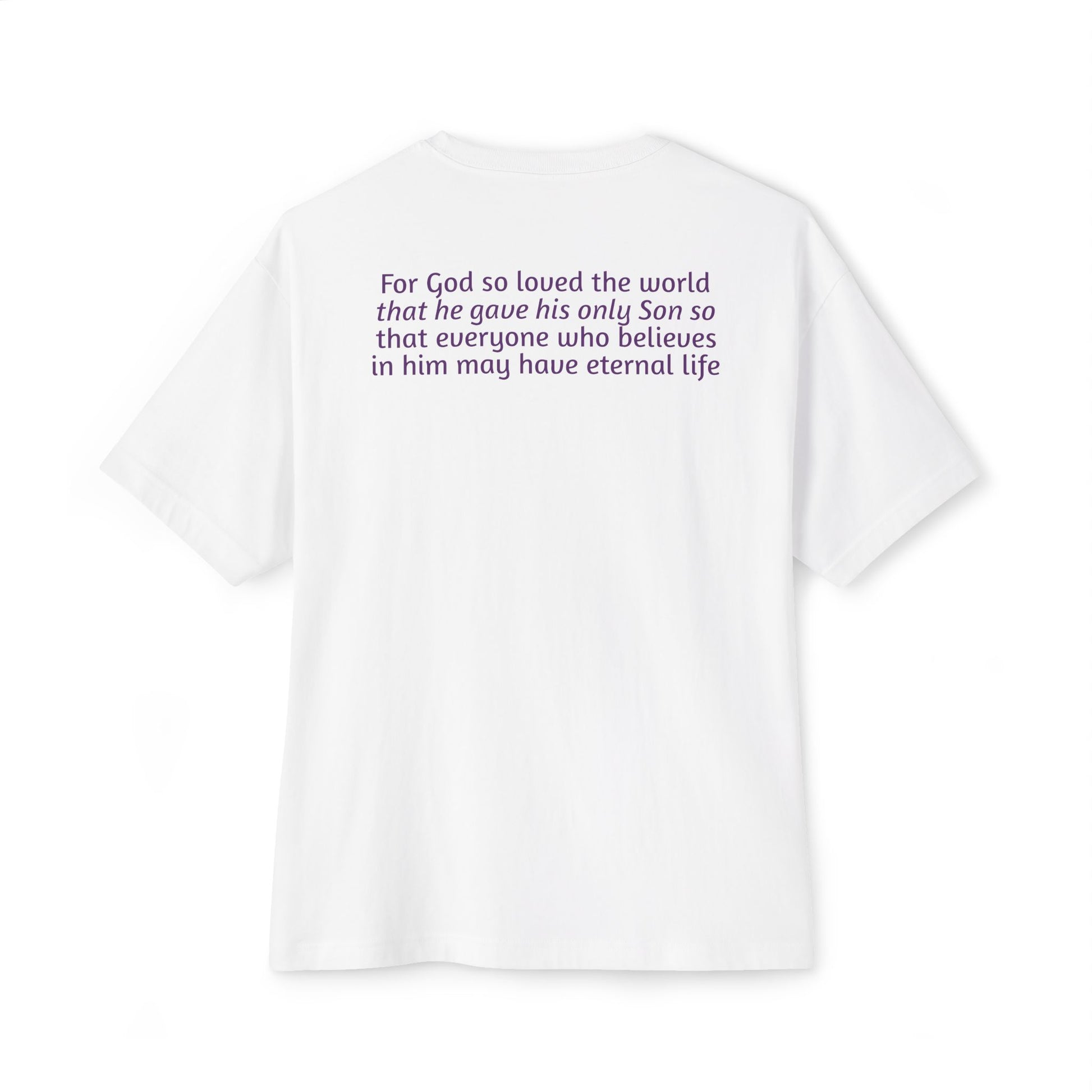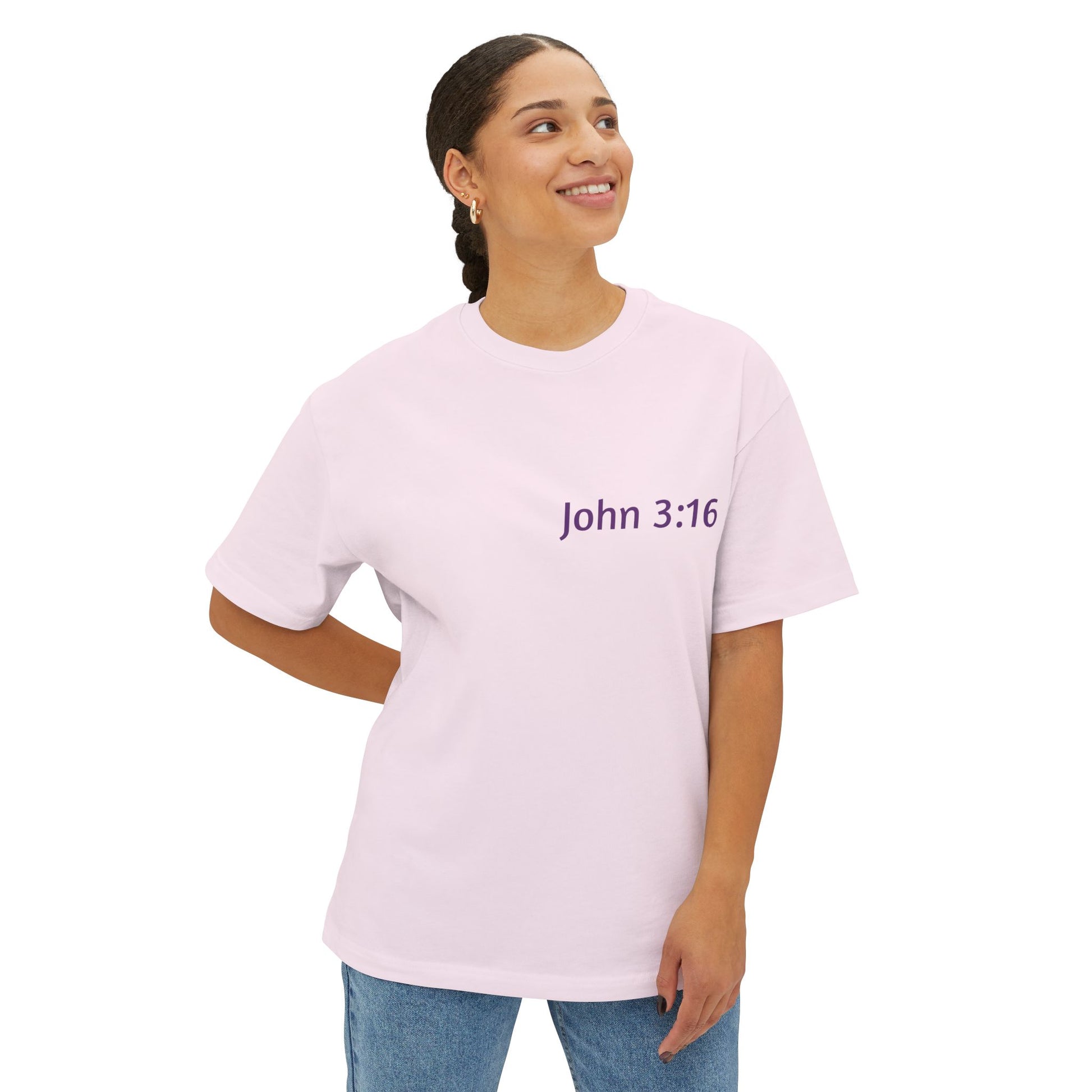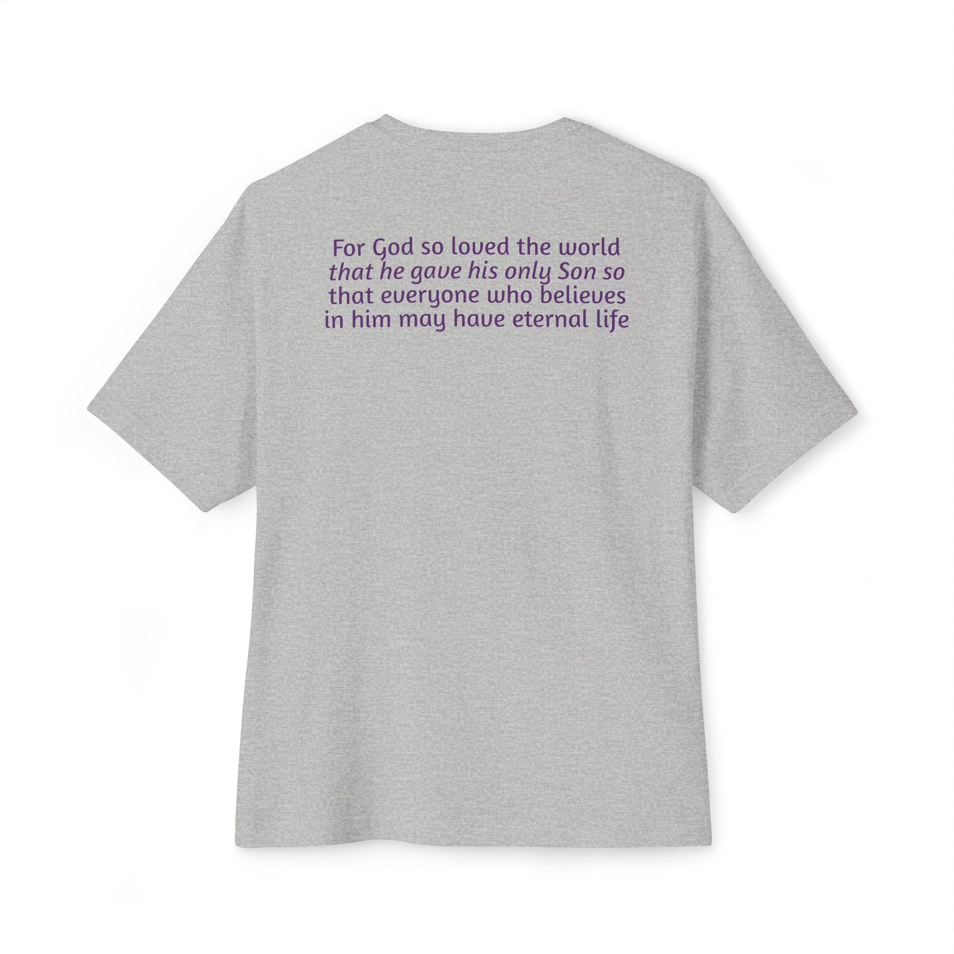 John 3:16 has been termed "the golden text of the bible" -- Introducing our Unisex Oversized Boxy Tee, the perfect blend of comfort and style for any casual occasion. This relaxed-fit tee is designed to provide an easy-going vibe, perfect for lounging at home or enjoying outings with loved ones. Its simple yet impactful design makes it an excellent choice for those who appreciate faith-inspired apparel and wish to express their beliefs subtly. Ideal for gifting during holidays like Christmas, Easter, or even casual summer gatherings, this tee resonates with individuals who value comfort and meaningful messages. Whether you're attending a church event or simply hanging out with friends, this tee fits seamlessly into your everyday wardrobe.
