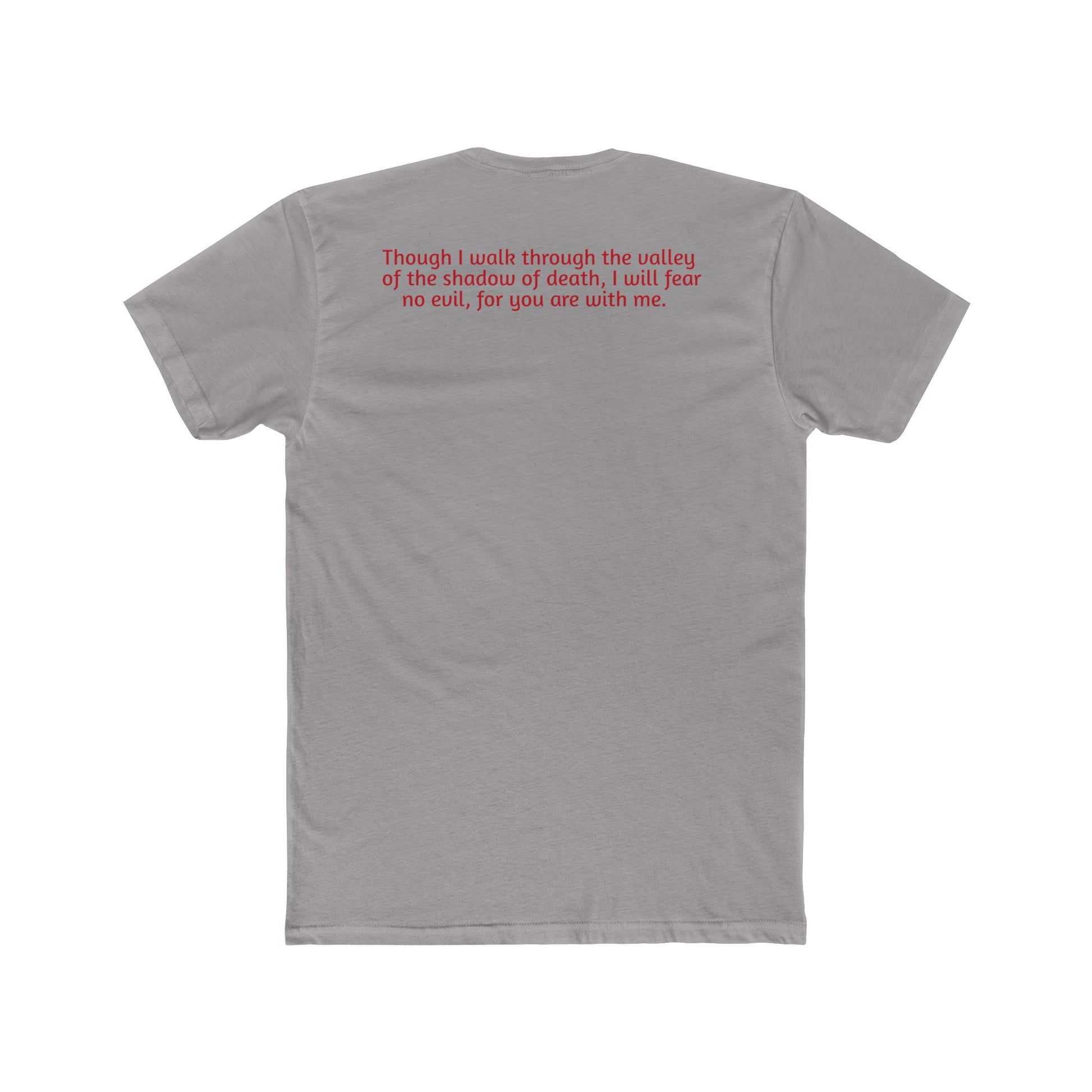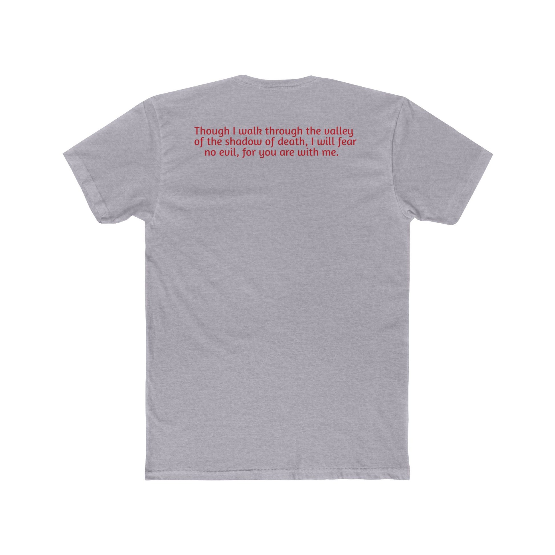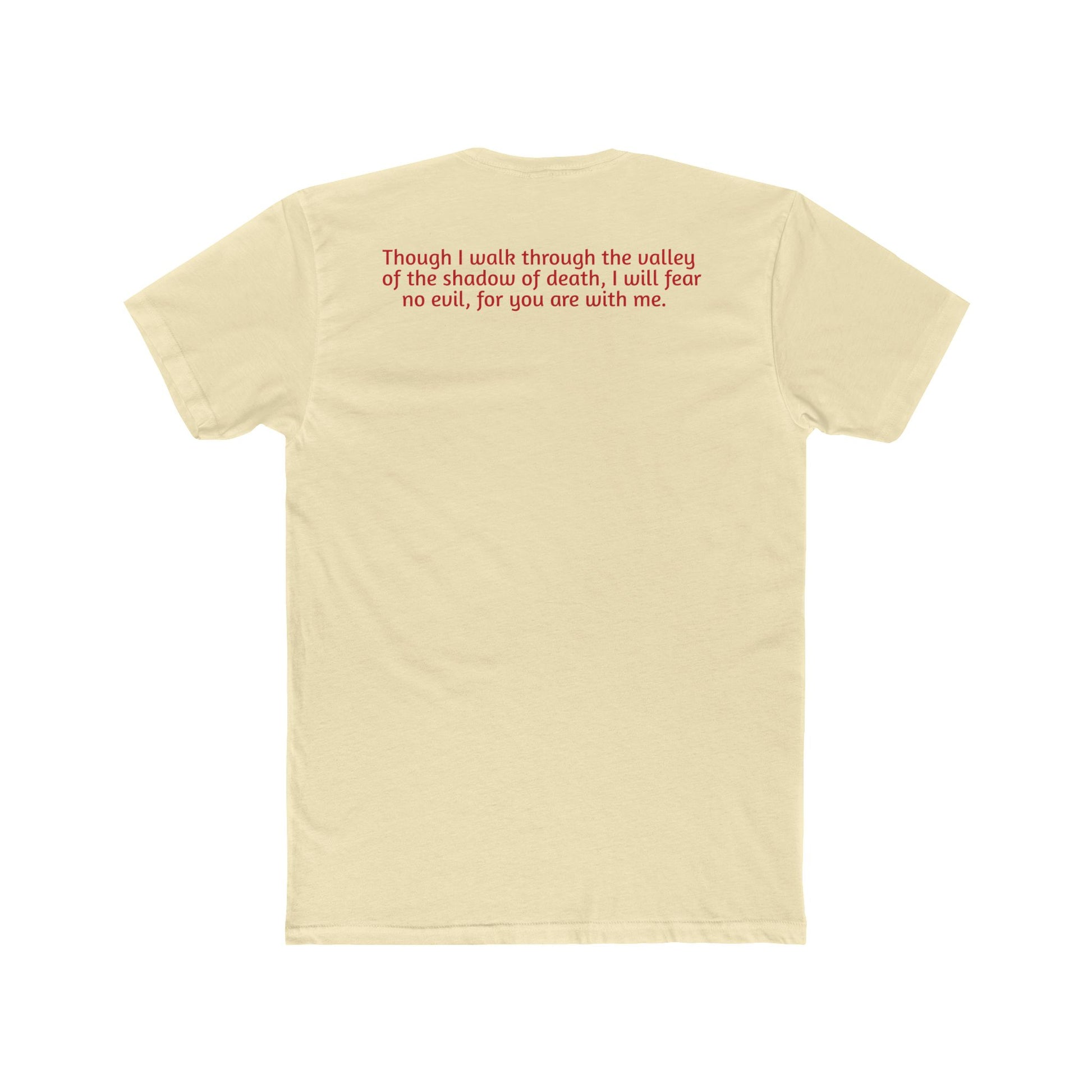 A Powerful message of courage and faith. "Though I walk through the valley of the shadow of death, I will fear no evil, for you are with me". PRINTED ON THE BACK. Introducing an inspiring Unisex Cotton Crew Tee that brings comfort and strength to your everyday life. This tee features a powerful message from Psalm 23:4, making it not just a clothing item, but a statement of faith and resilience. The lightweight fabric ensures year-round wearability, perfect for layering or wearing on its own. Ideal for those who embrace spirituality and wish to share their beliefs casually and confidently. This tee is a great choice for religious gatherings, daily wear, or thoughtful gifts for loved ones during holidays like Easter or Christmas, or during special occasions like baptisms and confirmations. Wear it to convey hope or simply enjoy its classic, versatile style that fits seamlessly into any wardrobe.